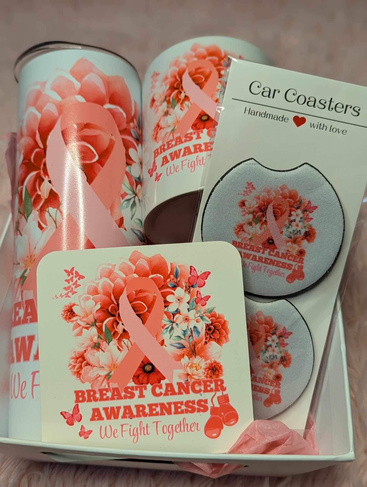 Show your support and spread awareness with our Breast Cancer Awareness Bundle. This bundle includes a tumbler, mug, coaster, and car coaster. Stay hydrated while showing your support and using these items at home or on the go!